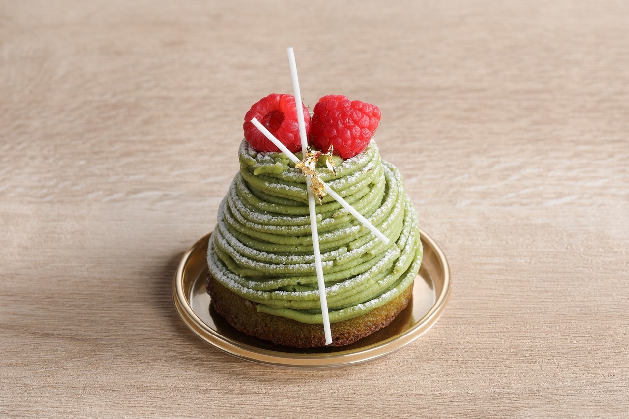 抹茶の渋みと栗のやさしい甘み、ラズベリーの酸味が絶妙に調和したモンブラン。抹茶フィナンシェの上にラズベリーのジュレを閉じ込めたバニラムースをのせ、抹茶と和栗のペーストを合わせたクリームを絞りました。