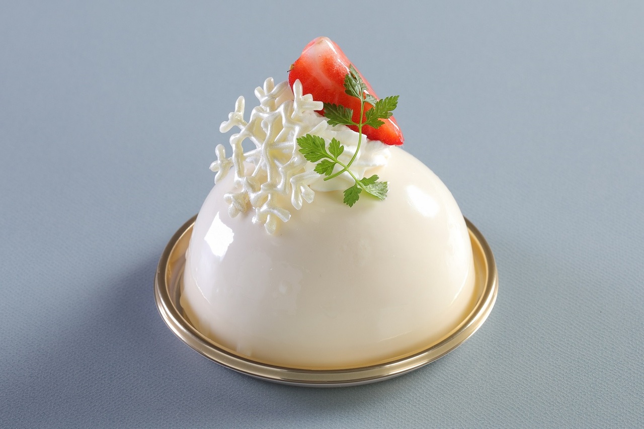 マシュマロのマフラーでおめかししたキュートな雪だるま形のムースケーキ。ヨーグルトムースの中にみかんのコンフィチュールを入れ、さっぱりとした味わいに仕上げました。