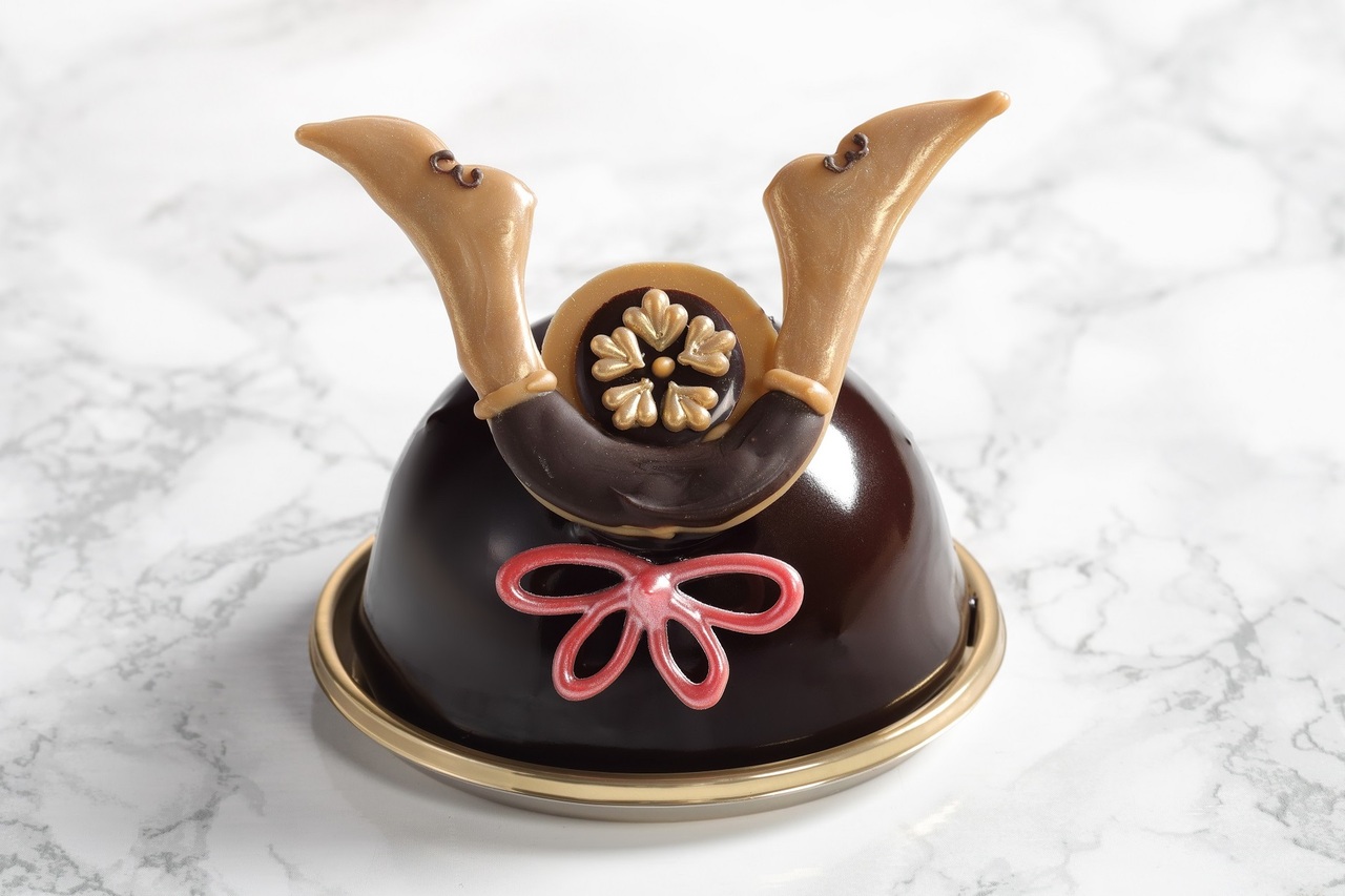 ほろ苦いキャラメルとチョコレートにバナナを合わせた濃厚な味わいのムースケーキ。大黒頭巾形で歯朶の葉の前立を添えている徳川家康の兜を表現しました。