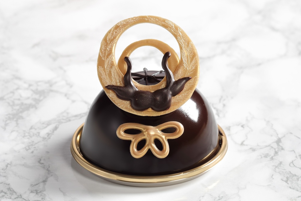 マンゴー、パッションフルーツ、チョコレートで仕上げたエキゾチックでさわやかな甘さのムースケーキ。豊臣秀吉の兜「一の谷馬蘭後立付兜」を表現しました。