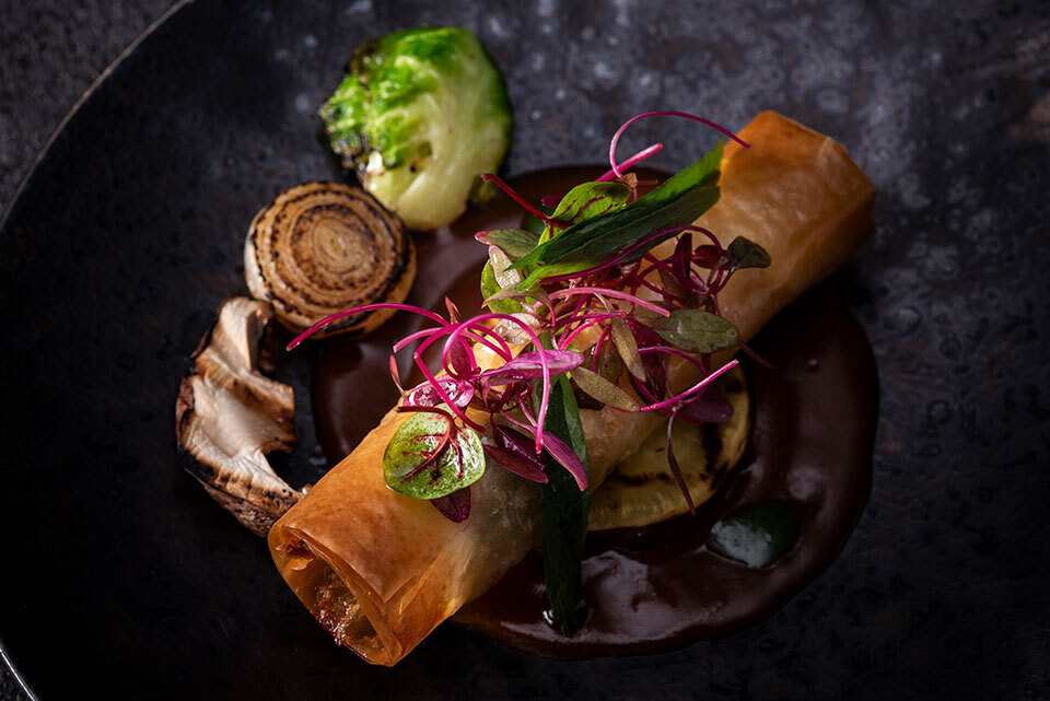 淡路どりとトリュフ風味ポテトのクレープ包み 焼きリンゴ仕立て