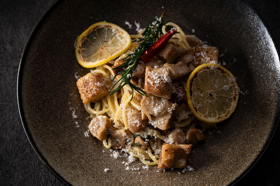 軽く炙ったマリネサーモン レモン風味のクリームを乗せて