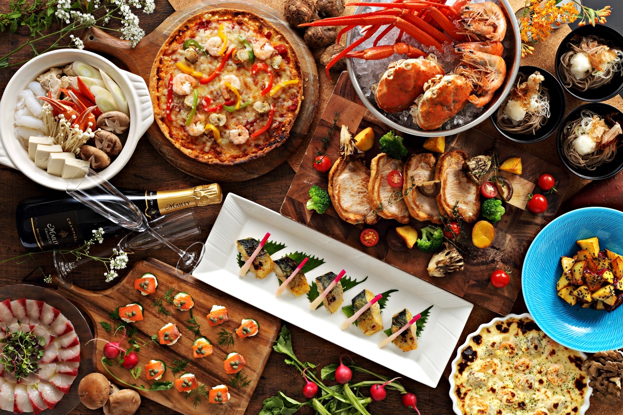 ポトフ、冬野菜のチーズフォンデュ、チキンのトマト煮、寒ぶりと大根の煮込み、冬野菜たっぷり味噌グラタン、シェフのきまぐれピザ、クリームシチュー、茶碗蒸し、点心、ズワイ蟹の氷台盛り、さつまいもとレーズンのメープル風、彩サラダバー、デザート各種、ソフトドリンクバー 等々約40種