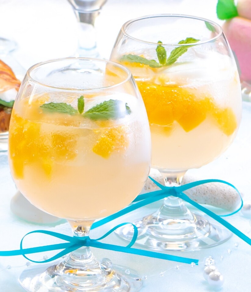 桃の果肉とヨーグルトシャーベットを浮かべた、甘く爽やかなピーチソーダ。