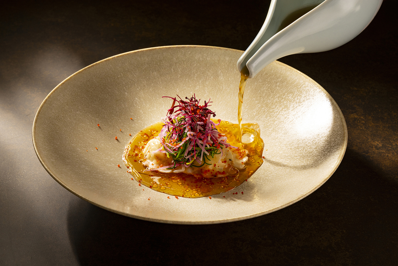 ・タスマニア産サーモンのモザイク ビーツと苺のガスパッチョ アイオリ 紅心大根のサラダ