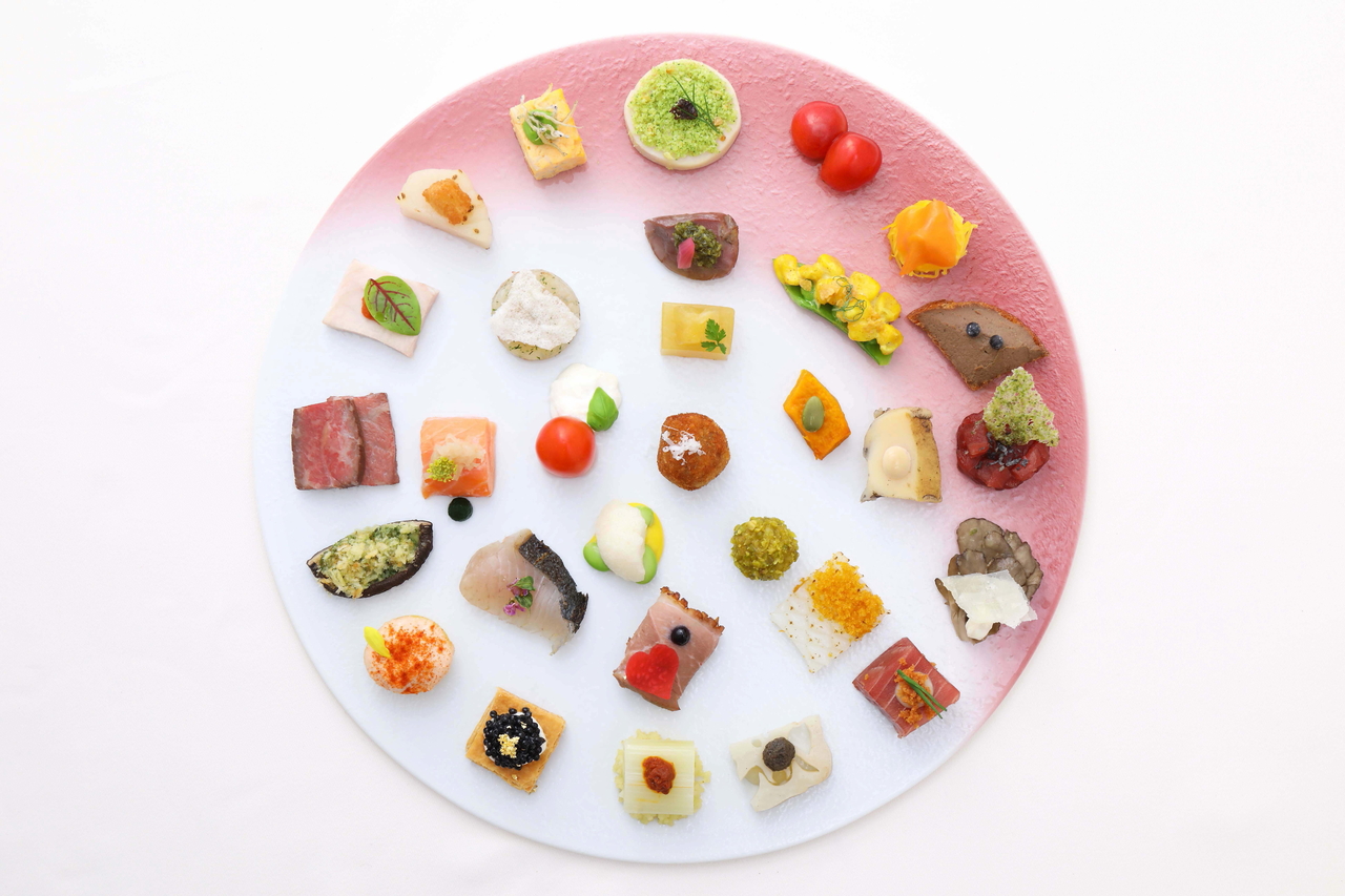 *前菜がスペシャリテの「インサラティッシマ・リナシメント(セレクション)」には、雲丹、キャビア、トリュフ、大トロ、鮑、短角牛などの、贅沢な食材を一皿に凝縮。