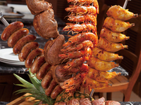 大人気のいちぼ・ランプ・エビなど11種類以上の食材をご用意。焼き上げた食材を串に刺してテーブルまで運び、目の前で食べたい分だけ取り分ける本格スタイルです。ブッフェ料理では、ブラジルの煮込み料理やサラダバーもお楽しみいただけ、約30種類をご用意しております。ドリンクバー付き