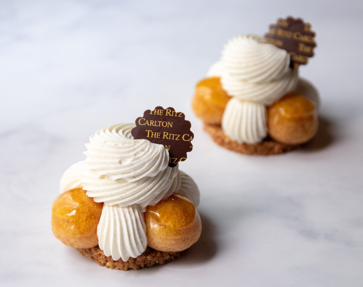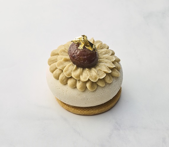 土台のパイ生地にゆずチョコレートを用いたパフペストリーを使用し、キャラメル風味のカスタードクリームを詰めたシューをのせ、 仕上げにはバニラの風味豊かなシャンティクリームをあしらっています。