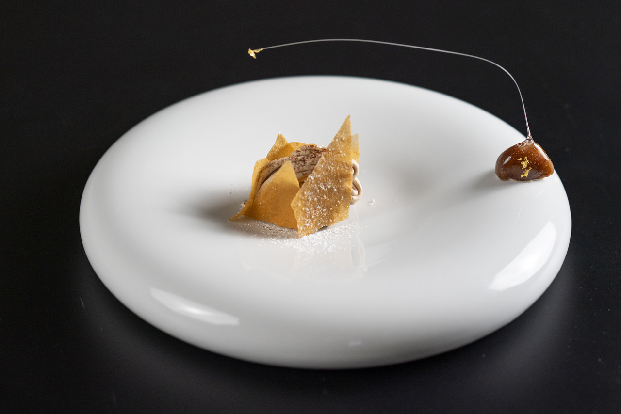 <Deuxième Entreè> フォワグラ、奥越産シャンピニオン、アワビのパイ包み焼き 軽いクラムチャウダー風