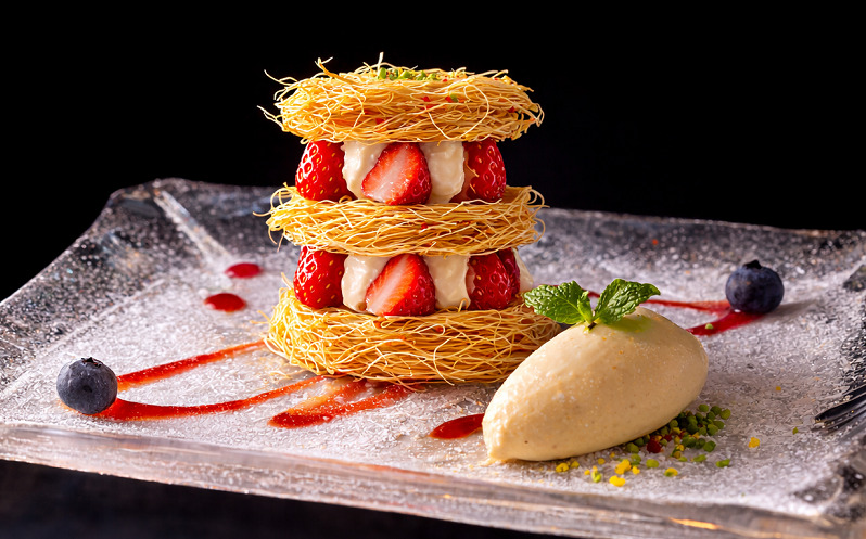 栃木県の農園「ハート&ベリー」のフレッシュな”とちあいか”に、グラスヴァニーユ(バニラアイス)、苺のチョコレートクリーム、まろやかな甘みのココナッツのブランマンジェ、軽く加熱し入れて旨味を凝縮した苺のコンフィを重ねた、芸術的な逸品です。