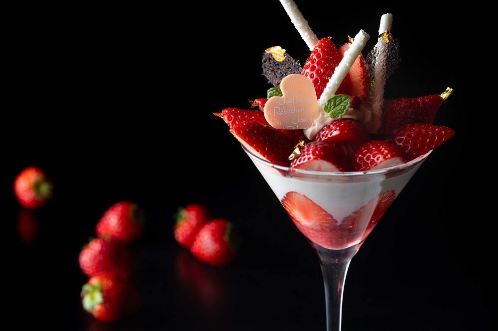 ハート型の飴のチュイルとココナッツを纏わせたメレンゲがアクセントになった、苺づくしのパフェをぜひご堪能ください。
