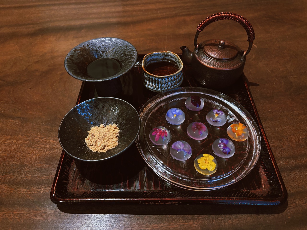エディブルフラワーをあしらった色鮮やかな華わらびとほうじ茶のセット。