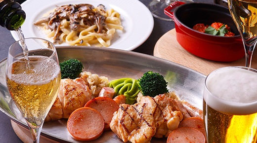 季節の食材を使用した豊富な内容のお食事6品とスパークリングワインや生ビールも楽しめる充実のフリーフローがセットになったディナープラン。