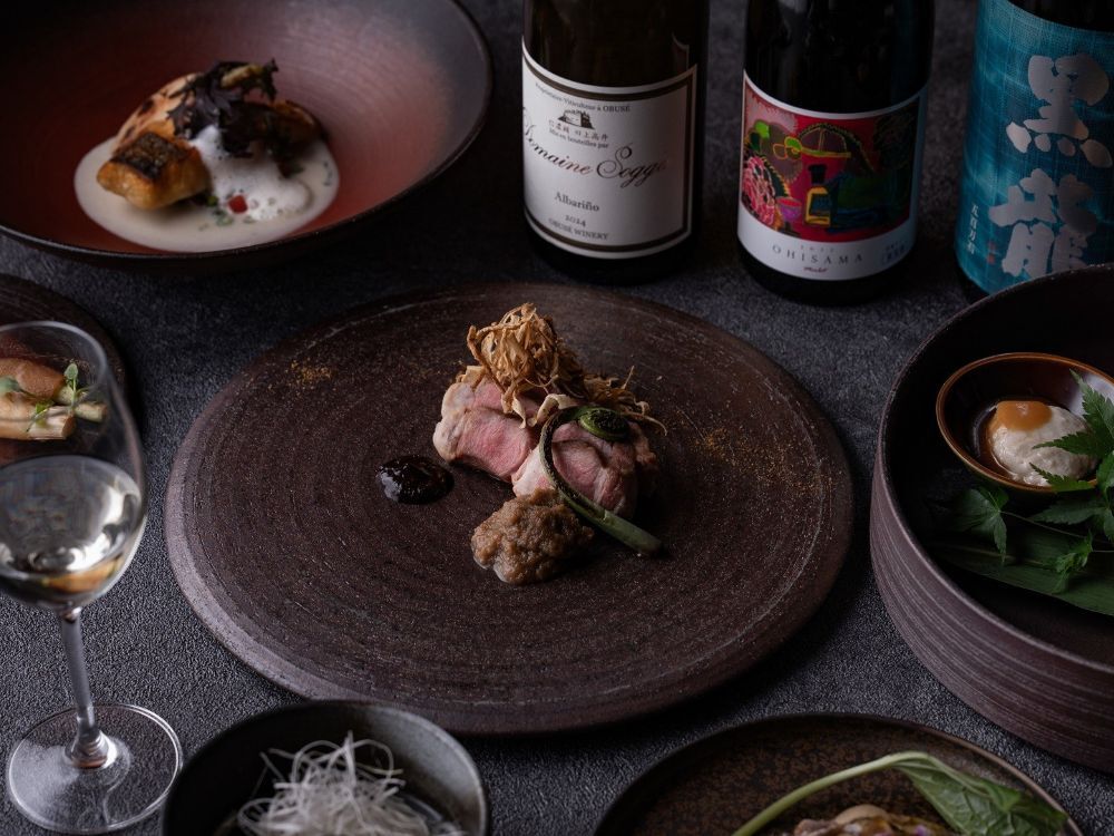 乾杯酒と里山の旬の食材を使用したディナーコースに、メッセージ入りデザートプレートが付いた記念日ディナーコースをご用意いたしました。