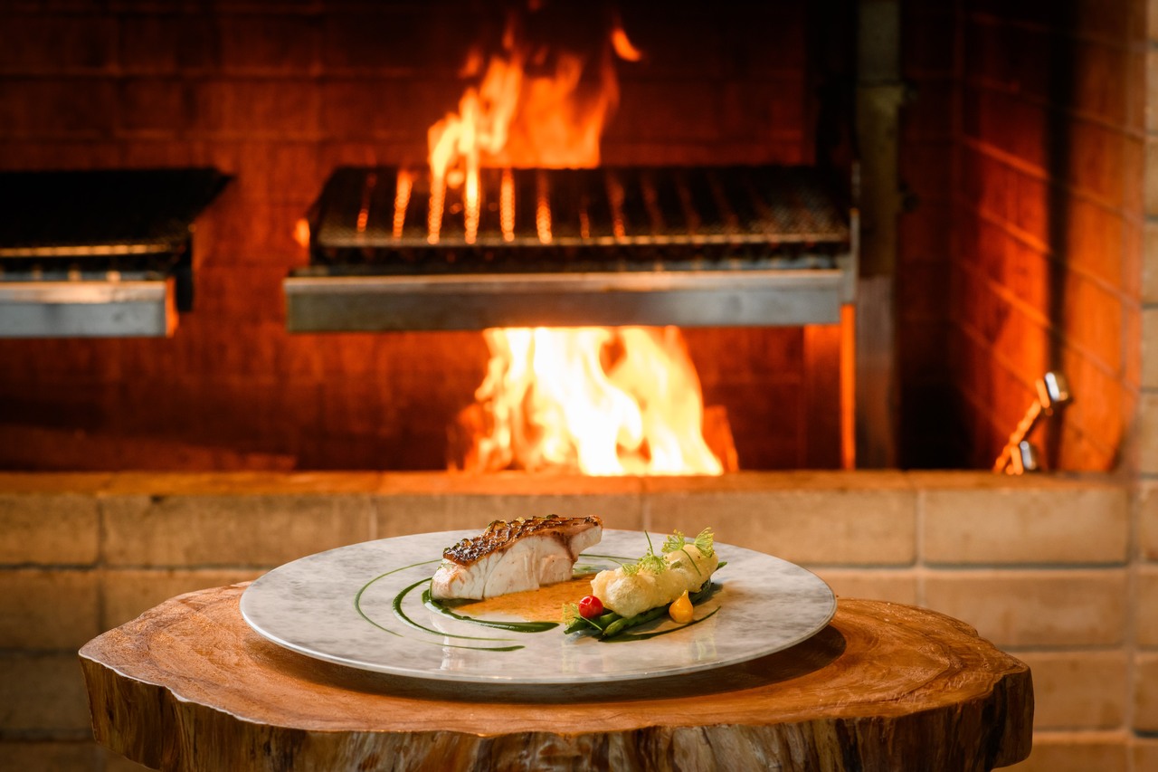 - 薪火で仕上げた鹿児島県産白身魚、白いんげん豆とキノコのラグー