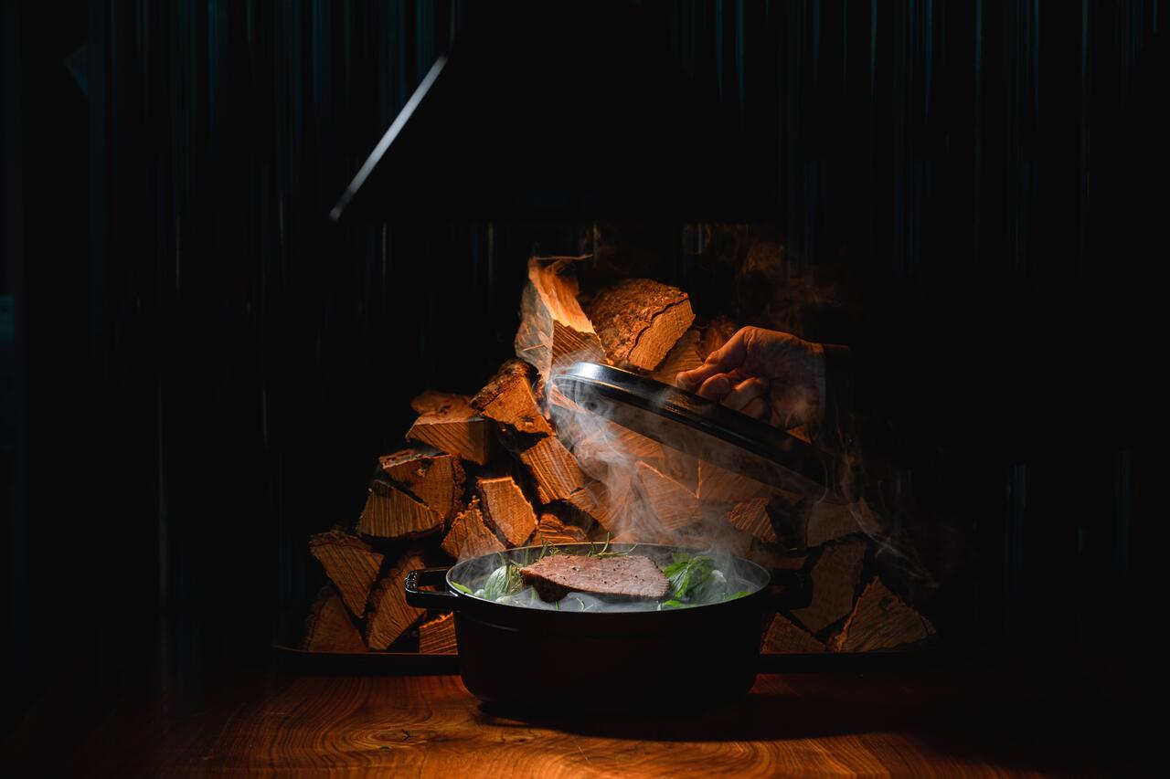 シェフ特製 鹿児島県産豚のポルケッタ ー フライングホグ風、らっきょうの薪焼きとキノコのデュクセル