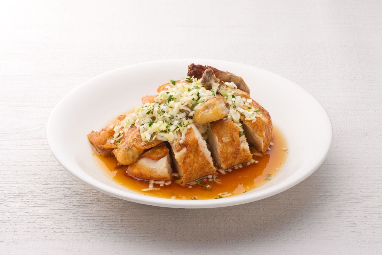四川省で愛されている鶏肉の炒めを県産地鶏「富嶽白鶏」で仕上げました。芽菜(ヤーツァイ)の独特な味わいをサンチュに包んでお召し上がりください。