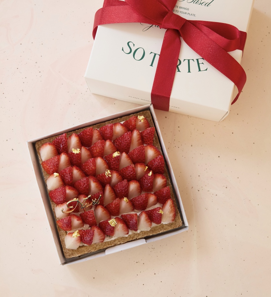 今年は新しく開ける瞬間も楽しめるクリスマスプレゼントのようなスクエアタルトをご用意しました。国産の最高等級のいちごをメインに土台となる生地は国産米粉のサクサクタルト生地。