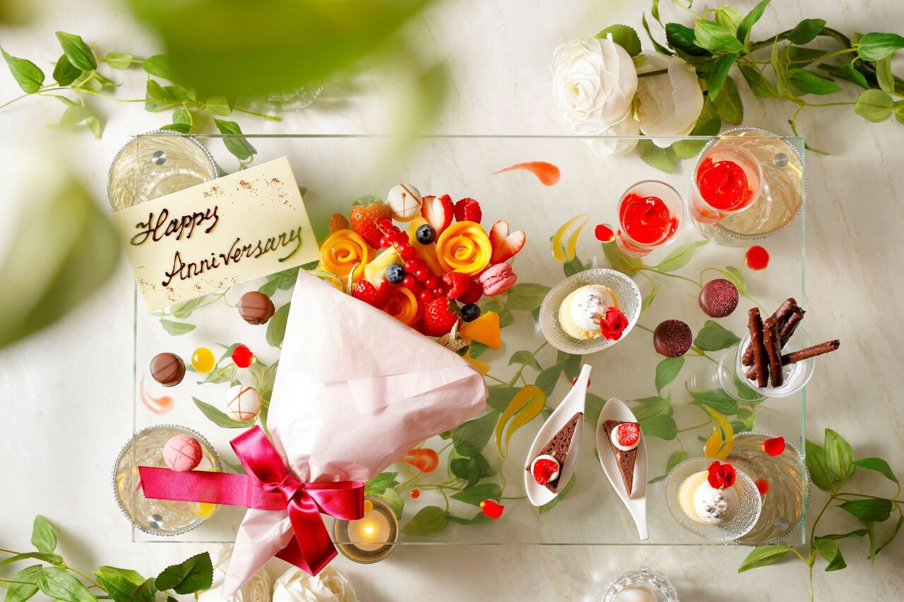 愛や感謝の気持ちを伝えるフラワーギフトをイメージし、色とりどりのデザートを可愛らしくデコレーションしたフルーツブーケをのせてご用意いたします。