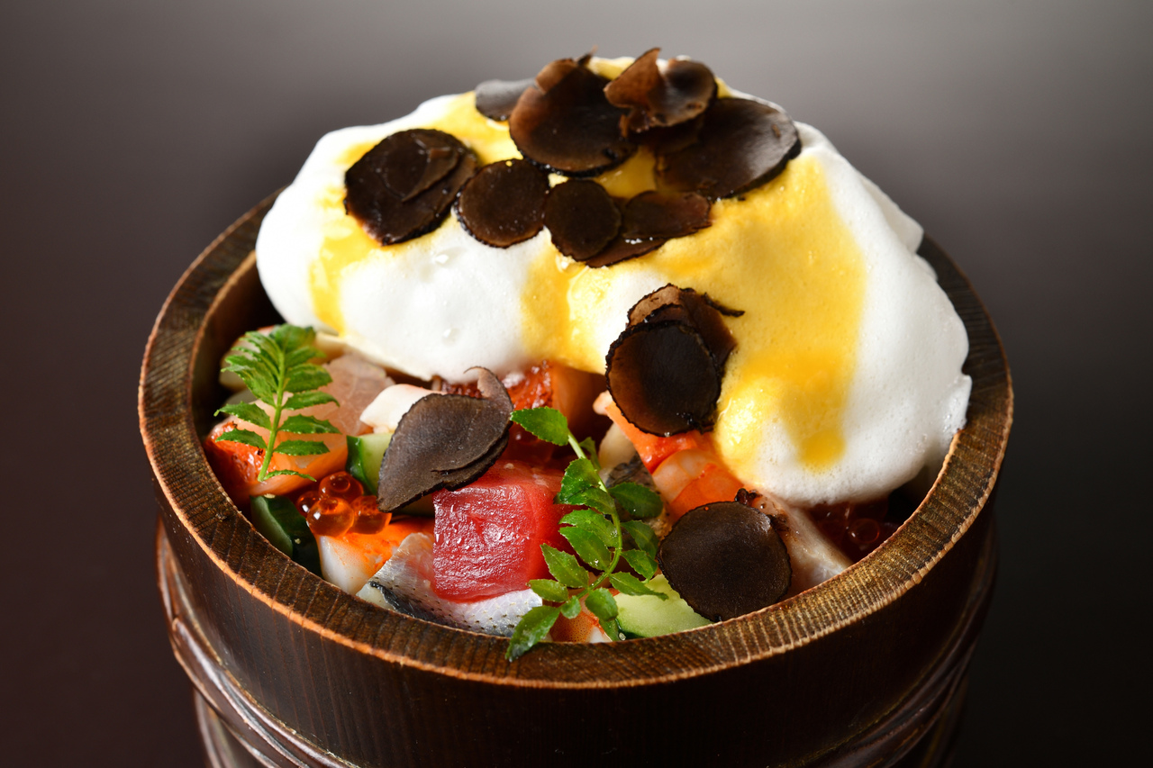 予約の取れない赤坂 鮨いつみで人気の、天然本鮪など江戸前しごとを施したネタと赤シャリの酢飯をトリュフ香るTKGにした逸品