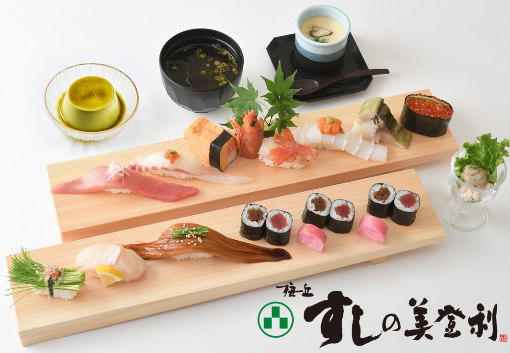 中トロ、たいポン酢ジュレ、玉子おぼろ挟み、大赤海老、季節のいかウニのせ、大名サバ、いくら、芽ねぎの梅肉のせ、ほたて塩レモン、穴子にぎり胡瓜のせ、かんぴょう細巻ハーフ、鉄火細巻ハーフ、季節のお新香、ミニかにみそサラダ、茶碗蒸し、お椀、デザート