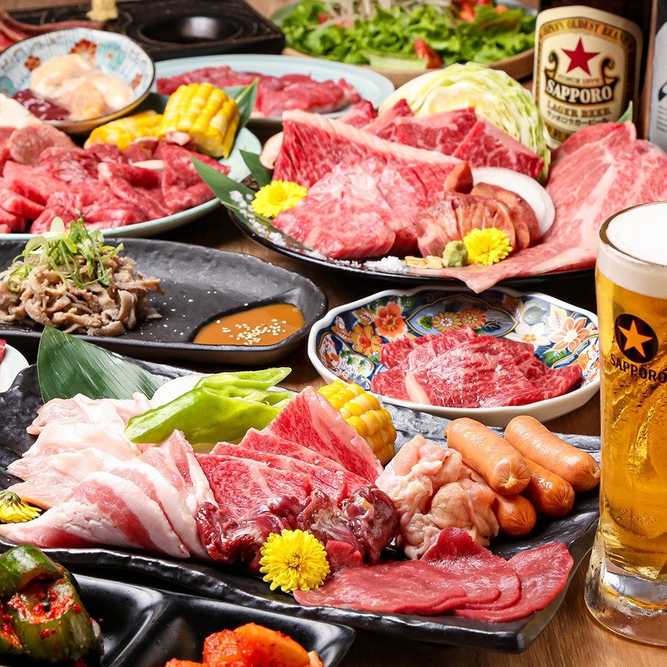 【12時-14時/昼宴会】10種の焼肉を堪能!ボリューム満点の焼肉宴会プラン♪大和牛カルビやリブロース、国産牛の赤身など全14品の充実の内容。選べる〆物も好評です。1名様1,500円追加で生ビール付き全60種飲み放題、1名様900円追加でノンアルコールビール付きノンアルコール飲み放題に変更OK
