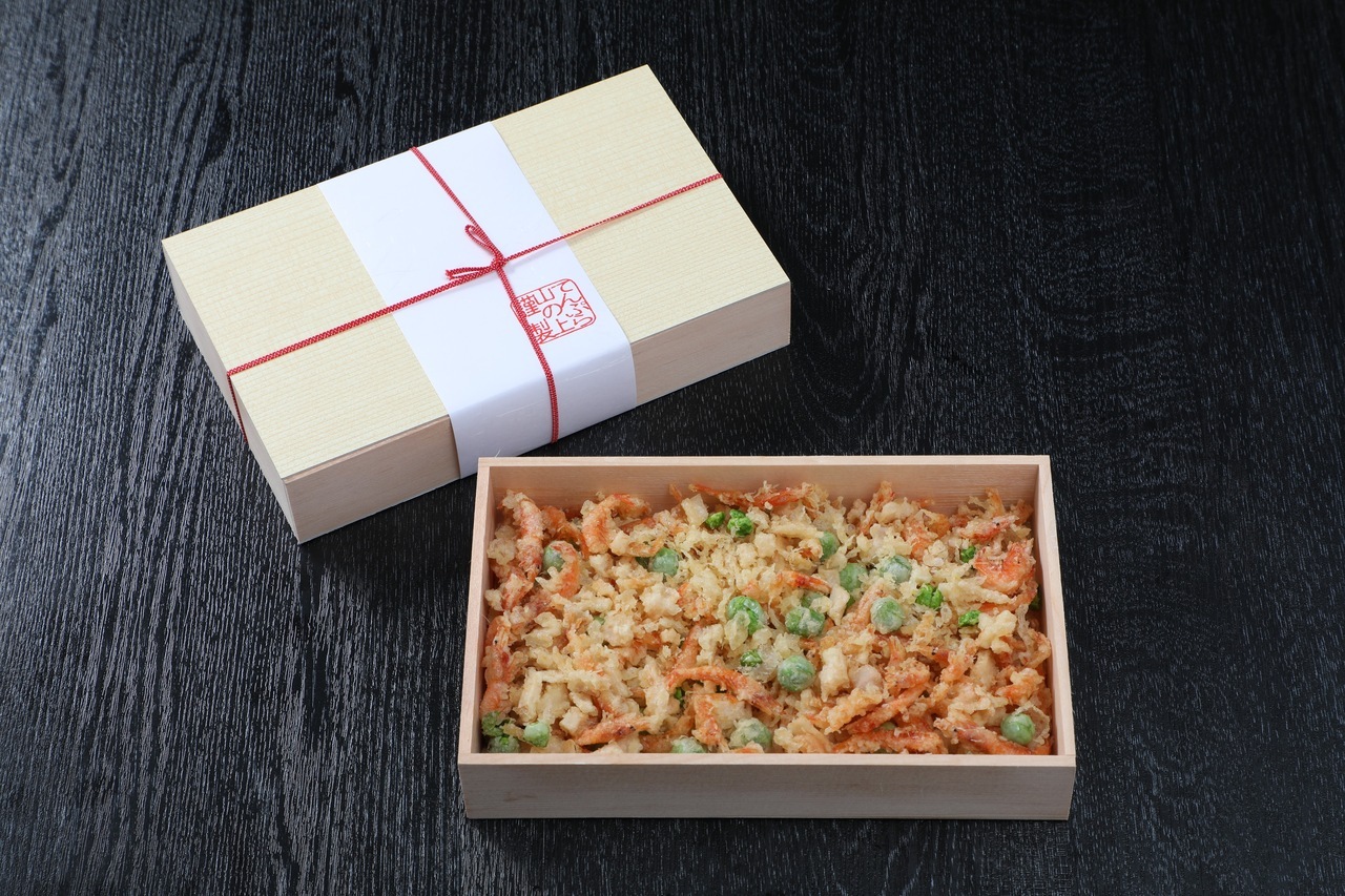 駿河湾の新鮮な桜海老や細かくした季節の香り野菜を使用した「てんぷら山の上Ginza」オリジナルの彩り豊かな揚げ玉です。