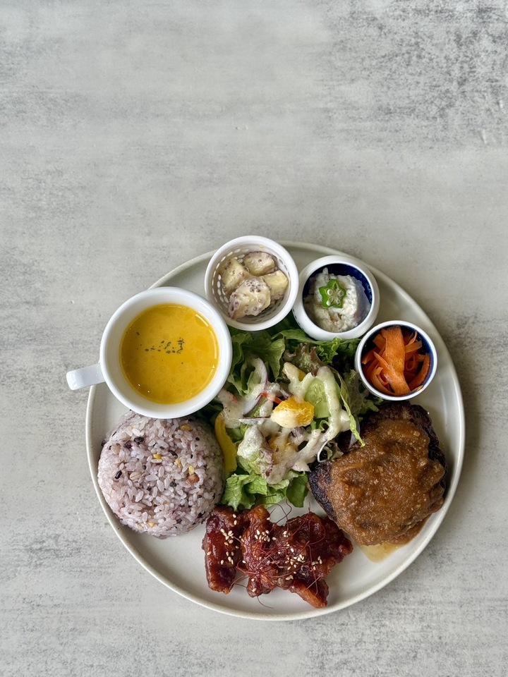 週替わりプレートのおかずに、小鉢、スープ、
