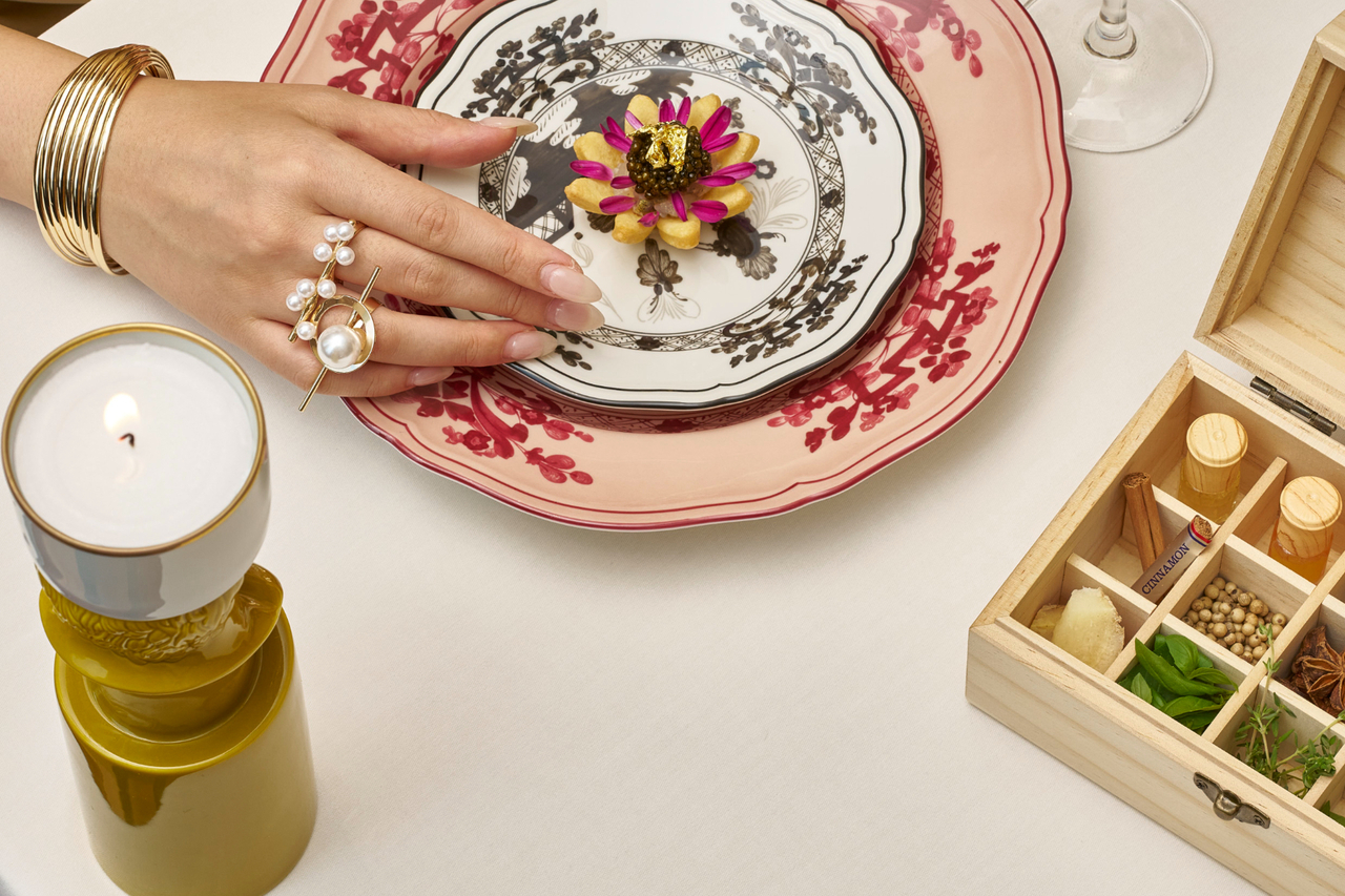 トスカーナの邸宅を思わせる温かな空間で味わう、シェフ吉田 道昭のクリエイティビティが光るフェスティブメニューの数々。真珠のパウダーを含むリキュールを使った「アンブロシア15」が、華やかな夜の始まりを告げます。