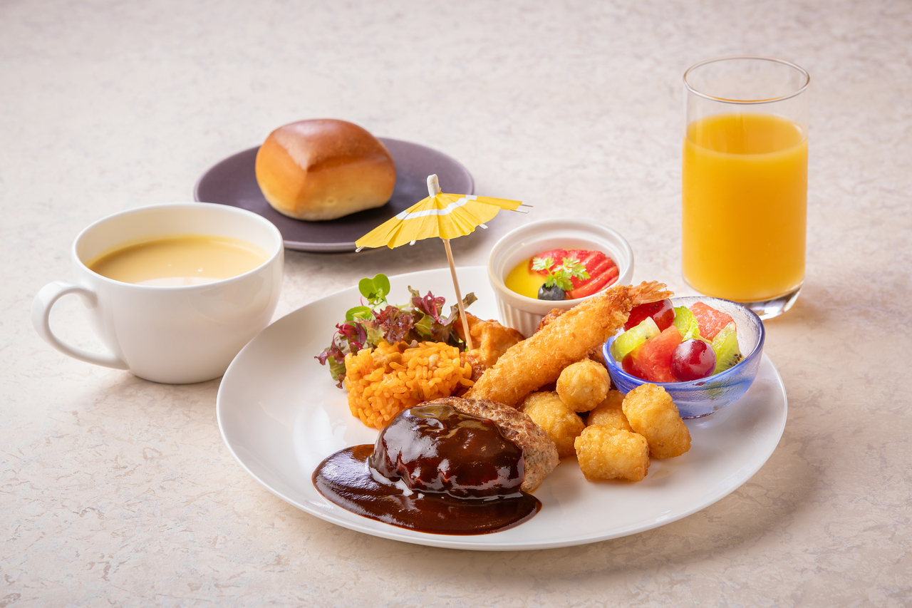 ●コーンスープ ●オムレツ ●チキンライス ●テーターポテト ●からあげ ●ミニエビフライ ●パン ●デザート ●オレンジドリンク(またはアップルドリンク)