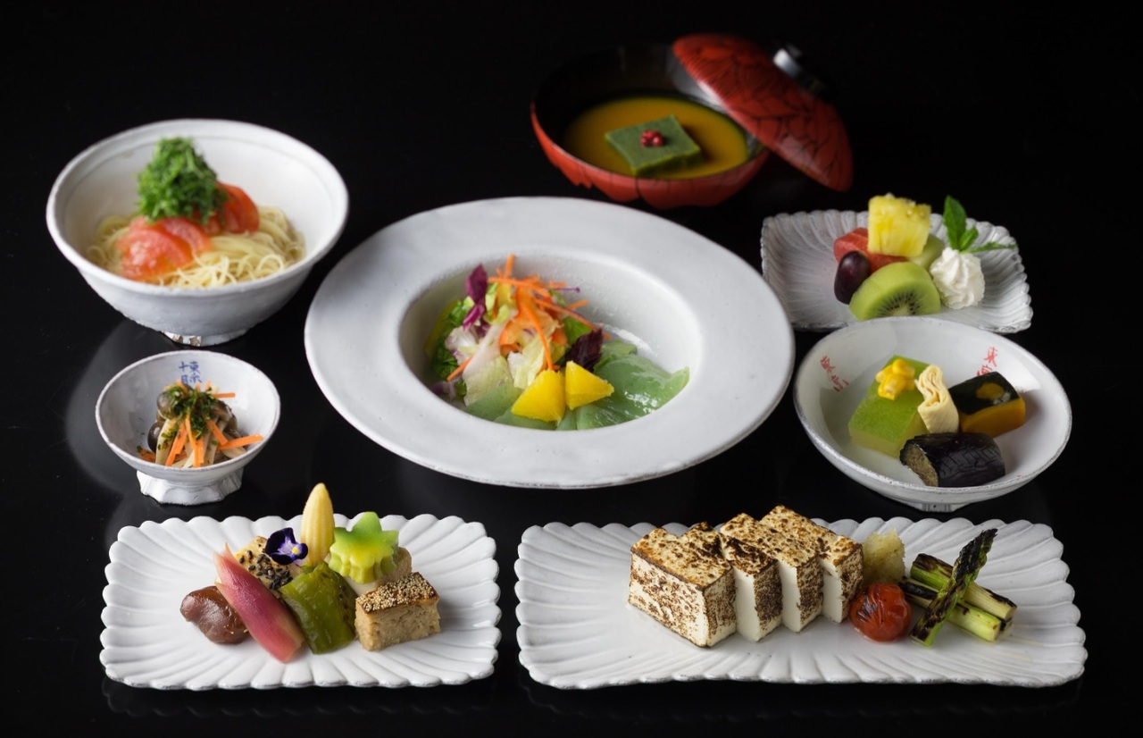 茶懐石料理をベースにした精進料理。動物性原材料を一切使用せず、身体に優しい旬の食材や調味料のみで仕上げています。海外からの旅行者をはじめ、国内外のベジタリアンやヴィーガンの方も安心して楽しめる内容となっています。