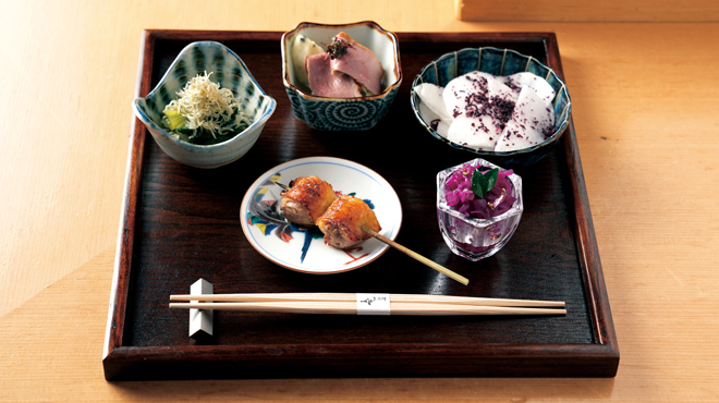 (一例:ささみ明太子、京鴨のロースト、金糸瓜の甘酢和え)