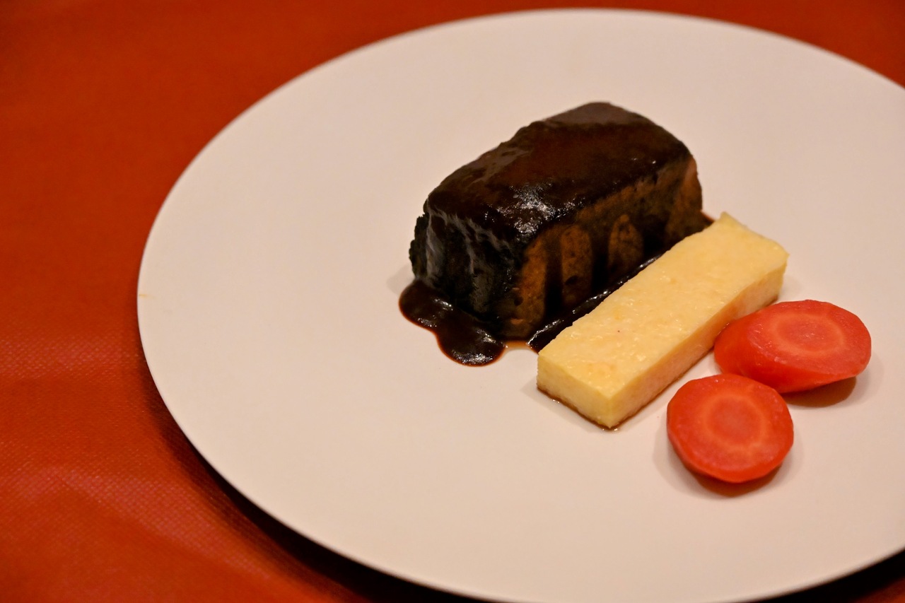 じっくり焼き上げた合鴨胸肉に、奈良県産ビーツの甘みとチョコレートのコクを合わせた一皿。