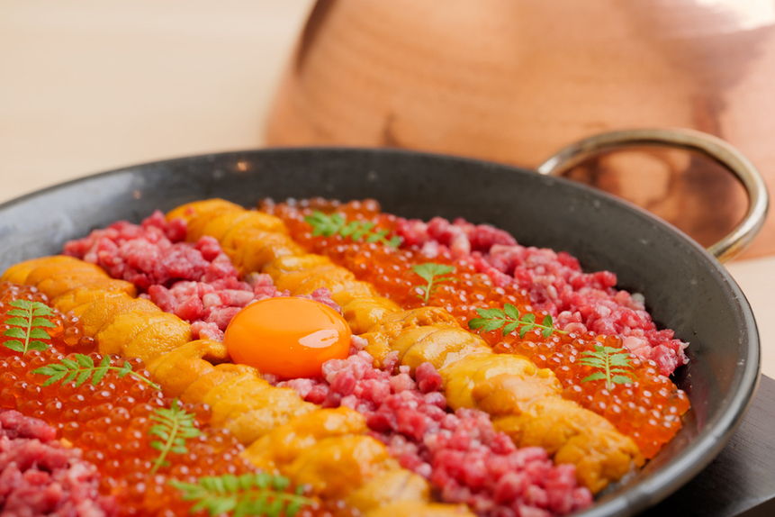 人気の「和牛の雲丹ユッケドッグ 〜目の前仕上げ〜」「和牛とカンジャンセウの石焼ご飯」をお召し上がりいただけます!「厳選ヒレのブリオッシュサンド」などのシグネチャー商品の拘りはもちろんの事、焼肉屋として極上の赤身尽くしに構成された「厳選和牛ヒレ産地別2種食べ比べ」を始めとした、厳選された焼物7種を部位ごとに薬味を変えて、最大限の味わいを引き出してご提供致します。全コースを焼きのスペシャリストによる最高の焼き加減でフルアテンド致します。