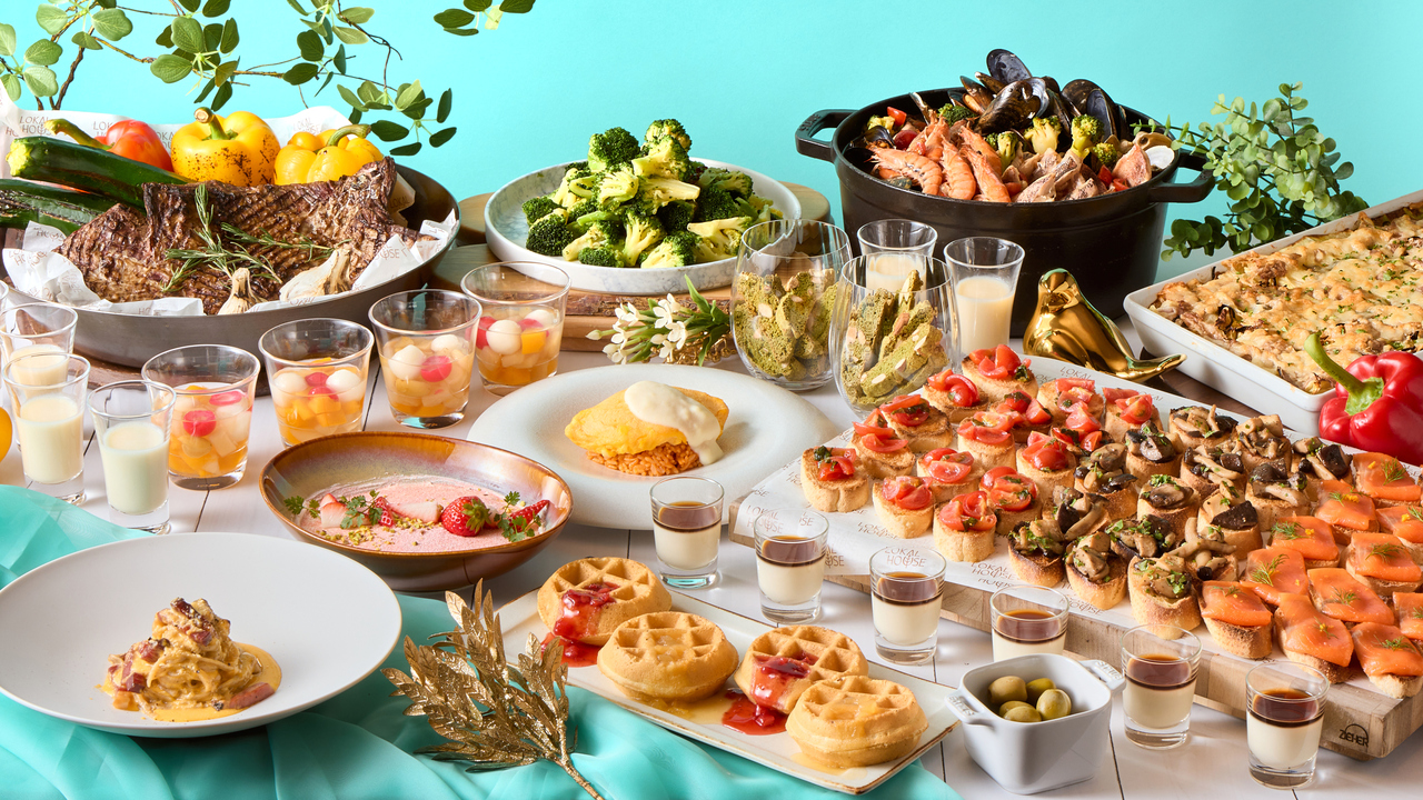 春らしい和伊折衷の豪華メニューや自分でトッピングができるカスタムピザ、更にお子様にも楽しんで頂けるチョコレートファウンテン等計32種の豊富なお料理をビュッフェスタイルでご用意💪✨