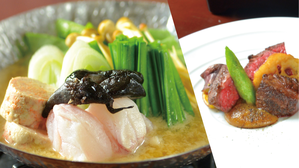 天草黒毛和牛・たらば蟹天麩羅・とらふぐ鍋佐渡 アカモクうどん・前菜・甘味など