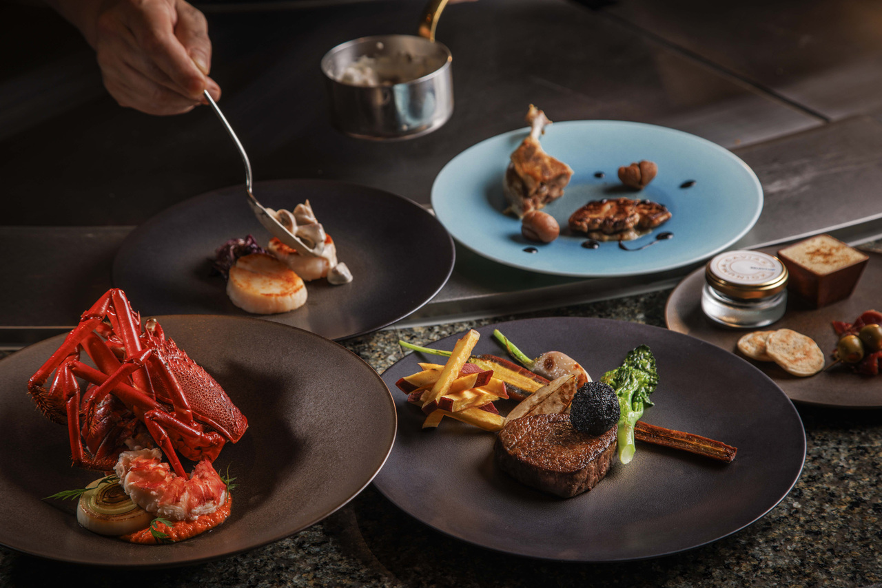 季節の前菜3品 / ロブスターのグリルまたは鮑のグリル / 鹿児島県産黒毛和牛 和牛食べ比べ / 焼き野菜 / お食事 / 季節のフルーツ、北海道産 濃厚で上質な生クリームのクレミア / コーヒー または 紅茶