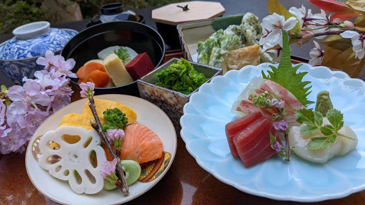 先付け、お造り、焼物八寸、焚き合わせ、酢物、天ぷら、鰆の桜蒸し、ご飯、止椀、香の物