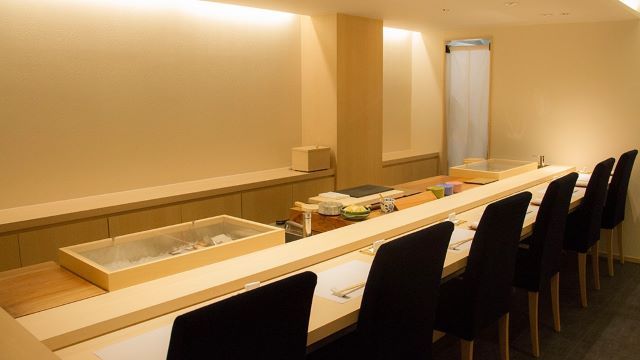 暖簾をくぐった先にあるのは、シンプルで清潔感にあふれた空間。カウンター席では職人が寿司を握る姿を眺めたり、気軽に会話を楽しんだりしながら食事が楽しめます。テーブル席も用意しています。寿司や料理は料理人のおまかせとなりますが、お客様のお好みに合わせた対応も可能です。寿司はお客様のお食事のペースに合わせて、最適なタイミングで提供します。シャリやワサビなどにもこだわった寿司を心ゆくまでご堪能ください。