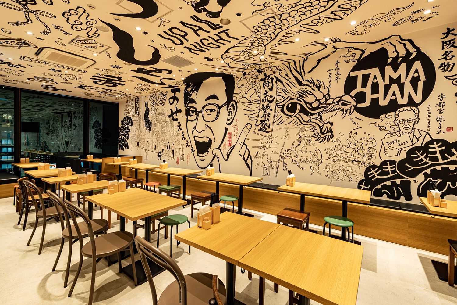 お好みたまちゃんは、大阪の人気店の味を継承し、プラスオリジナルのテイストを加えたメニューを提供しているお店です。シンプルなお好み焼きや焼きそばの他にも韓国料理や鉄板焼きなど多彩なメニューをご用意、粉モン文化の大阪の味を存分に堪能していただけます。カジュアルな雰囲気の店内は62席のテーブル席となっており、入り口とのれん、天井から壁に続く手書き風の個性的なアートも共にお楽しみいただけます。