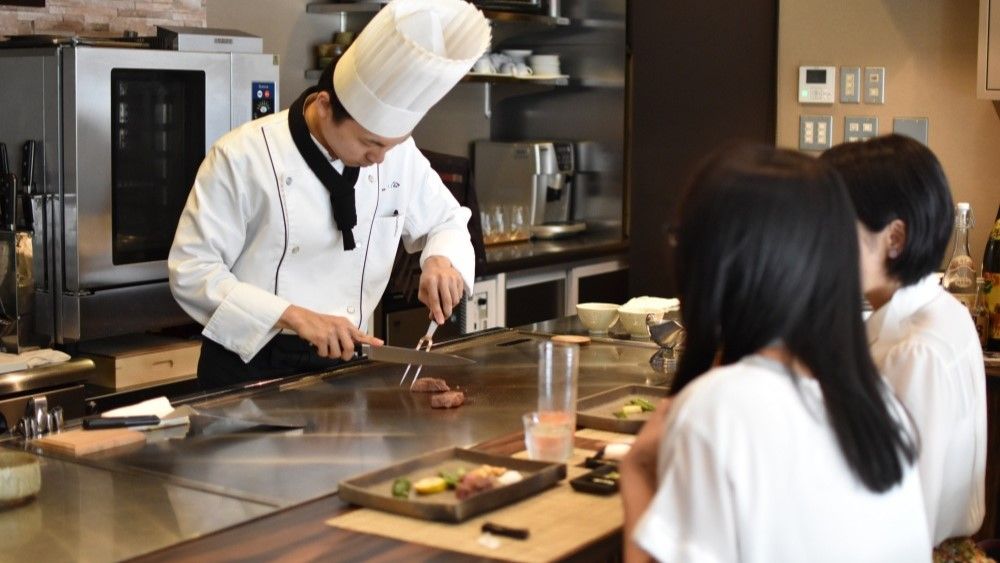 店内に足を踏み入れると、木目調の落ち着いたシックな雰囲気が広がっています。カウンター席がございますので、目の前で食材が焼かれていく様子をお楽しみいただけます。もちろんご接待、ご商談をしたい方はテーブル席のご利用も可能です。美味しい鉄板焼きを味わいたい方のために、黒毛和牛をはじめ旬の魚介類、地場野菜などこだわりの食材をご提供しています。日本酒、ワイン、ビールなどのアルコール類も豊富に揃えていますので、料理と一緒にお楽しみください。