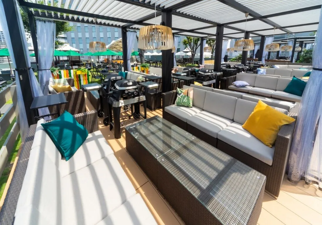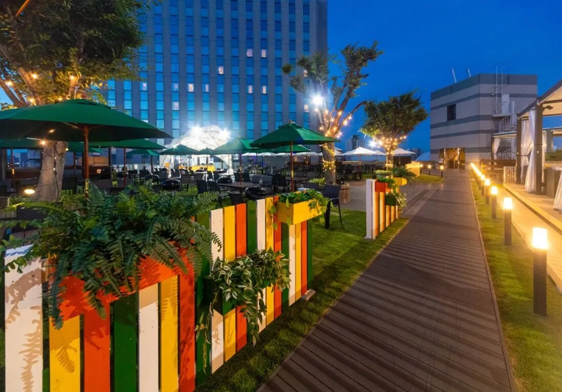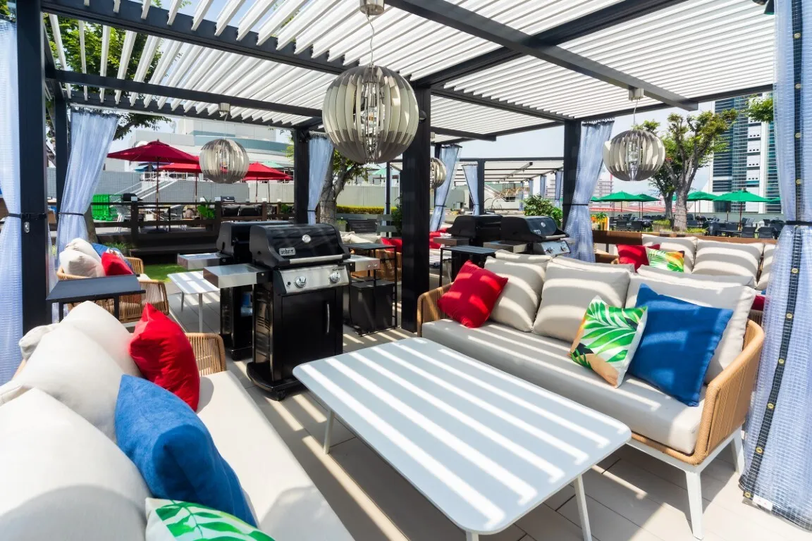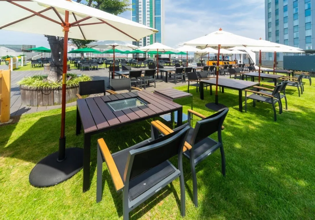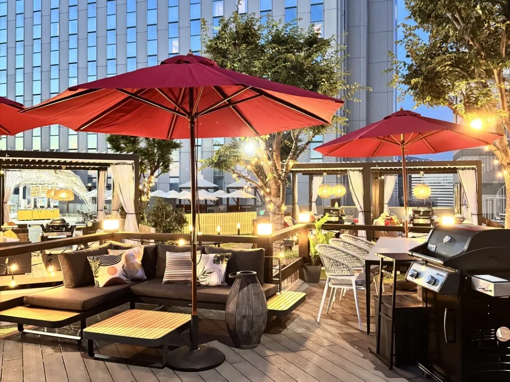 都市と自然が融合した「アーバン・ネイチャー」の考え方を取り入れた空間に、スマートテクノロジー搭載の直火では難しい手軽さと一定の温度キープが特徴の電気グリルを設置。