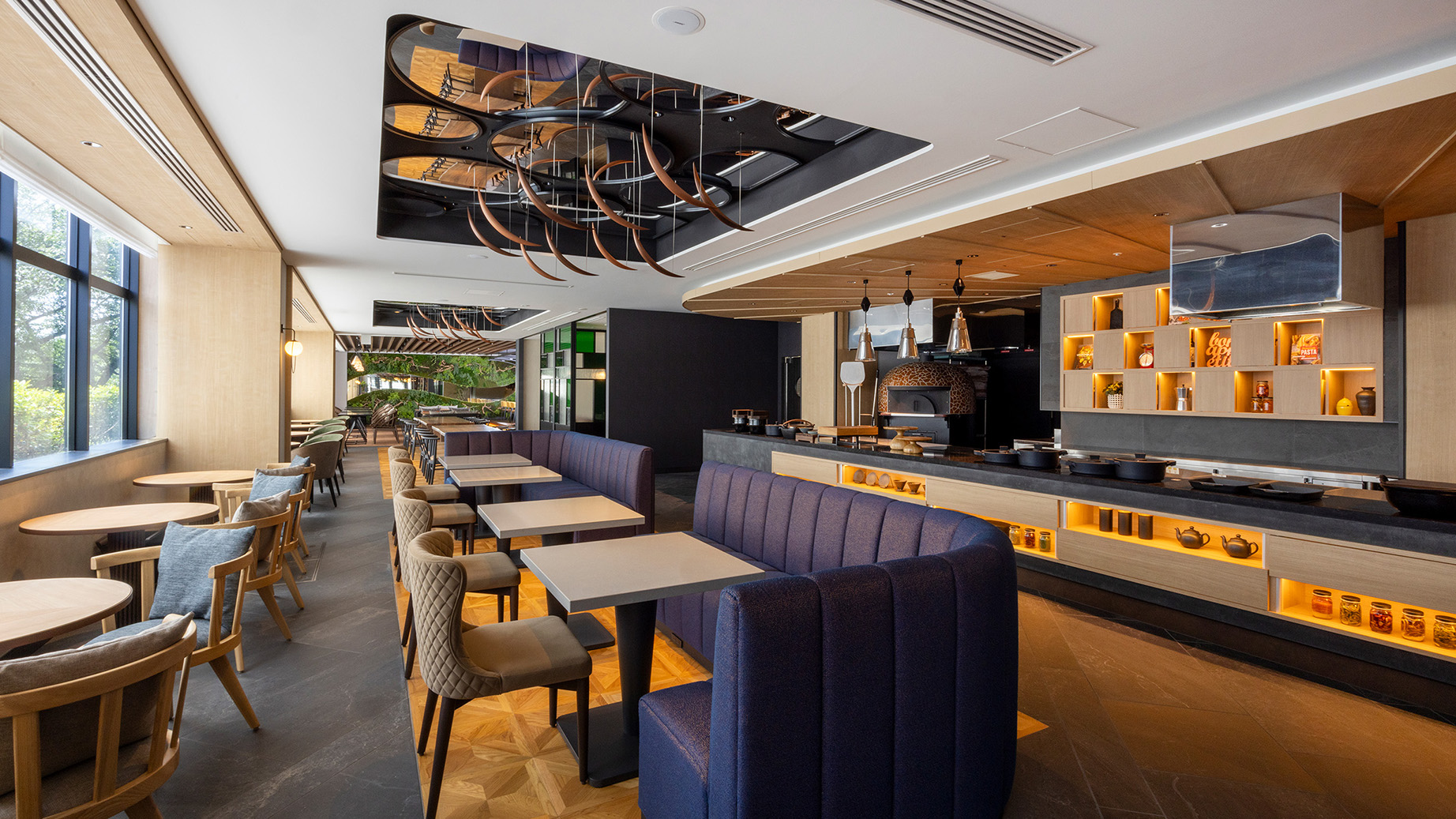 トラットリア・ポンテ奈良では、奈良の豊かな食文化を取り入れたイタリアンを心ゆくまでお楽しみいただけます。シェフが腕を振るうオープンキッチンで焼き上げるピザや季節の素材を使ったパスタは絶品です。デザインコンセプト「Upside Down Garden」に基づいた内装が、穏やかな自然を感じさせる空間を演出します。様々な座席が用意されており、プライベートなグリーンウォールスペースも貸切可能です。
