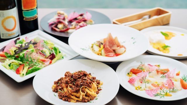 海のレストランでは、穏やかな海を眺めながら本格的なイタリア料理をお楽しみいただけます。ランチではパスタとお肉のセットメニューをご用意しており、ディナーでは豊島らしさを楽しめるコースメニューをお楽しみいただけます。豊かな海の、豊かな島には、豊かな食材を使った、季節感あふれるお料理をぜひお召し上がりください。