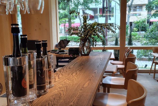 循環型ランドスケープを軸にした緑豊かな複合施設「西川テラス」の1階にあります。昼から夜までいつでもナチュラルワインが飲めてアラカルトでお料理を楽しめるビストロです。
