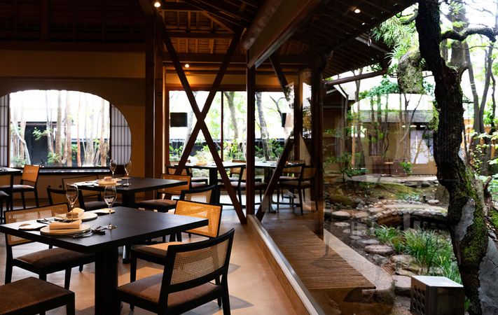 前身の老舗料亭「和多伴」の歴史と伝統を受け継ぎフレンチレストランにコンバージョン。天井が高く開放感に満ちたダイニングエリアは、大きな窓一面に日本庭園を臨み、美しい日本の四季を愛でながら、豊富にご用意したワインとともに食事をお楽しみいただけます。また、ライブさながらにシェフたちのパフォーマンスを間近に感じていただけるオープンキッチンスタイルを採用。2室ある個室は、接待を始め、家族や親族でのお集まり、さらに全館貸切りでのレストランウェディングなど、多岐にわたるシチュエーションでご利用いただけます。