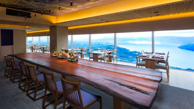 店内は和とモダニズムを融合させたような空間です。大きな窓から洞爺湖を一望できる絶好のロケーションで、板前が腕を振るう料理をお楽しみいただけます。北海道産の食材をふんだんに使ったメニューが豊富にございます。蟹御飯や北海道産牛の炙り、五目餡かけなどをご用意。食事後にはバニラ香る羊羹と季節のフルーツといったデザートも準備しております。銘酒も取り揃えておりますので、料理とともにご堪能ください。
