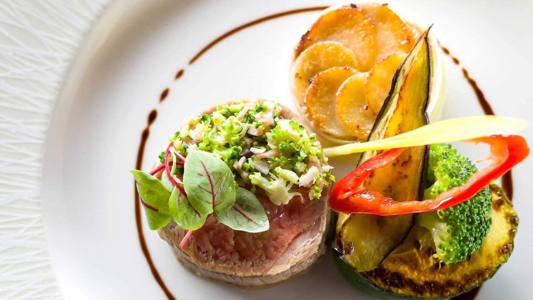 Sample Menu ■December-February [Appetizer] Pressed Fried Chicken with Shiitake Mushroom Consommé Jelly [Soup] Pumpkin Potage [Fish Dish] Fresh Fish Venoise with Shungiku Sauce [Meat Dish] Roasted Itoshima Pork Loin with Jerusalem Artichokes from Fukuoka Prefecture [Dessert] Strawberries and Amazake Fromage Cru [Bread] [After-Dinner Drinks]
