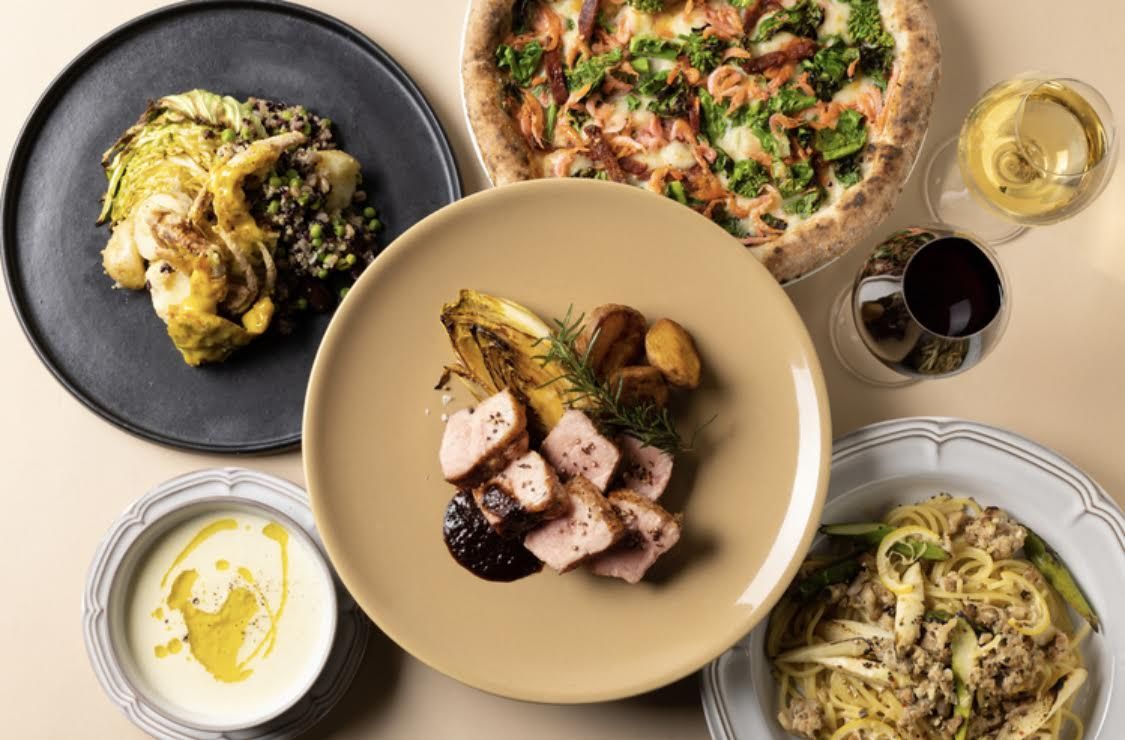 店内はシンプルで落ち着いた雰囲気の空間です。広々としたテーブル席だけでなく、開放的なテラス席もご利用いただけます。ハウスステーキや数種類のピザに加え、デザートとしてパンケーキやアイスクリームをご用意。キッズプレートもお選びいただけるので、家族皆んなで食事をお楽しみください。国産クラフトビールやオーガニックワイン、季節のフルーツを使ったフレッシュサワーなどドリンクメニューも充実しています。