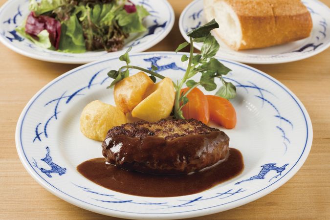 秘伝のタレと伝え続けられた技術で磨き上げた若鶏の唐揚げ。「銀座に来たら、三笠会館で鶏の唐揚げ」とまで言われ、人気を博していました。当時は、ぶつ切りの骨つきのまま提供され、みな熱々のところを手で召し上がっていました。現在も骨付きのままでご提供させて頂いており、その香ばしい味わいは今も昔も変わりません。ハンバーグは和牛の挽肉と脂の美味しいやまと豚を7対3のブレンド。肉汁豊かでふっくらと美味しく、肉の旨みがたっぷりと楽しめます。変わらない調理方法が、その美味しさをいつまでもお届けします。